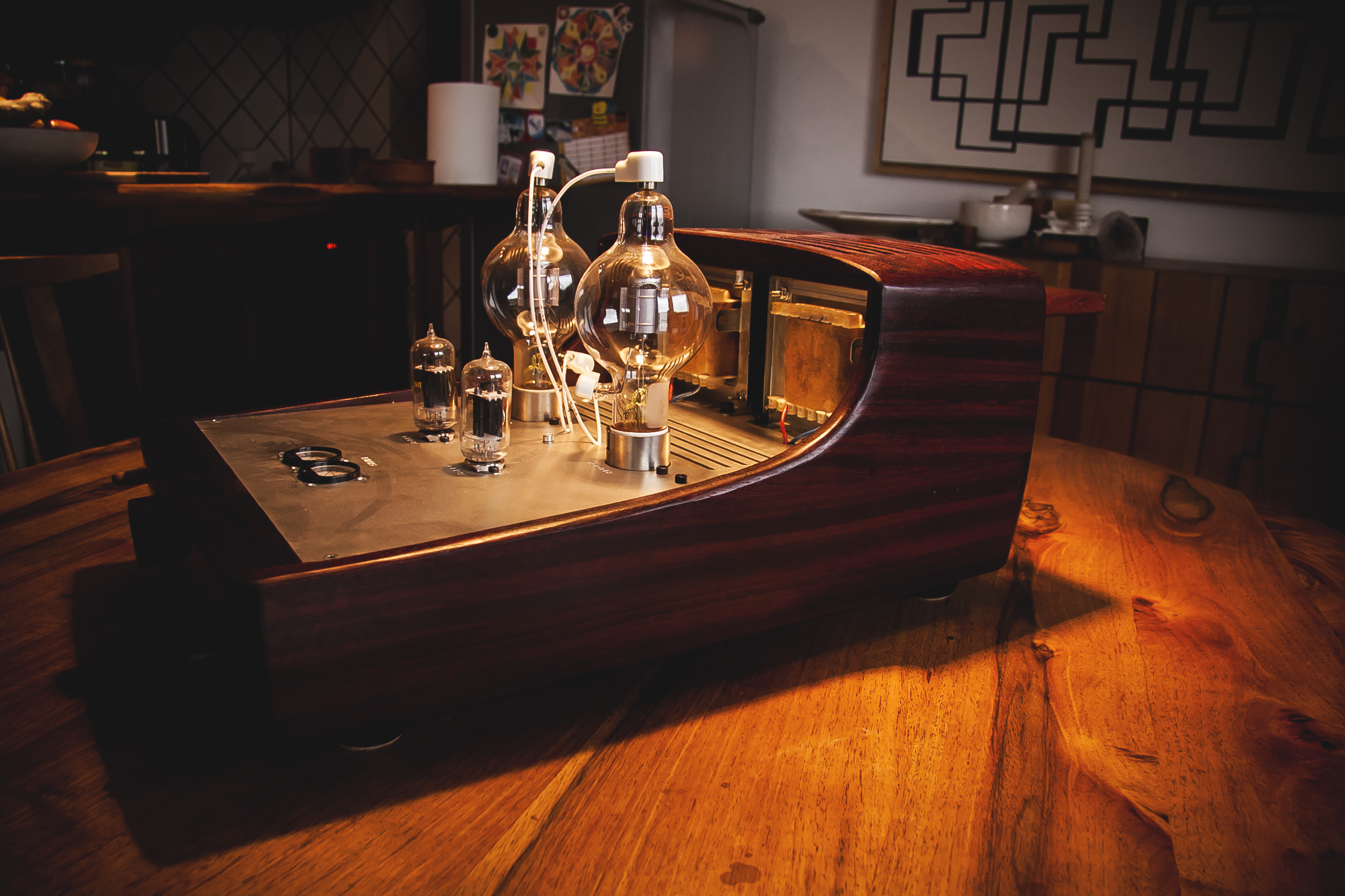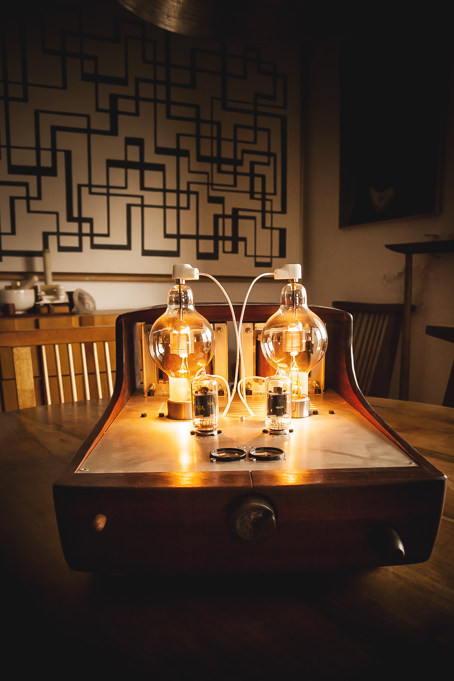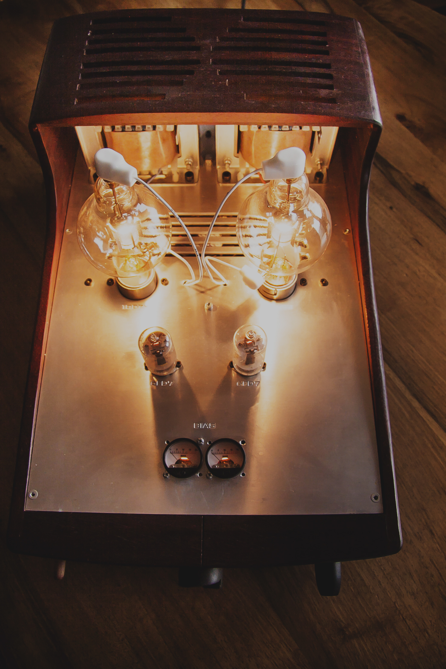 The amplifier in such embodiment is unique worldwide. Assembled with rosewood knobs and ebony potentiometers. The case and parts are completely handcrafted, knobs, potentiometer buttons and every little thing is finished in fine grinding to a high gloss and coated with a special solution, (which is the secret masters) for high brilliance and wood naturalness. The robust case provides the minimal impact of vibrations on the lamps and thus reduces any possibility of microphony. The amplifier uses the bias control, so you can follow the life of the tubes (for this type of tube projected lifespan is almost 10,000 hours, unlike ordinary tubes which is around 2,000). Output transformers as well as the power transformer are oversized eliminating the chance for overload providing higher quality sound. The lamps are TH100 with thorium-tungsten, more persistent than conventional lamps used for tube amplifiers.